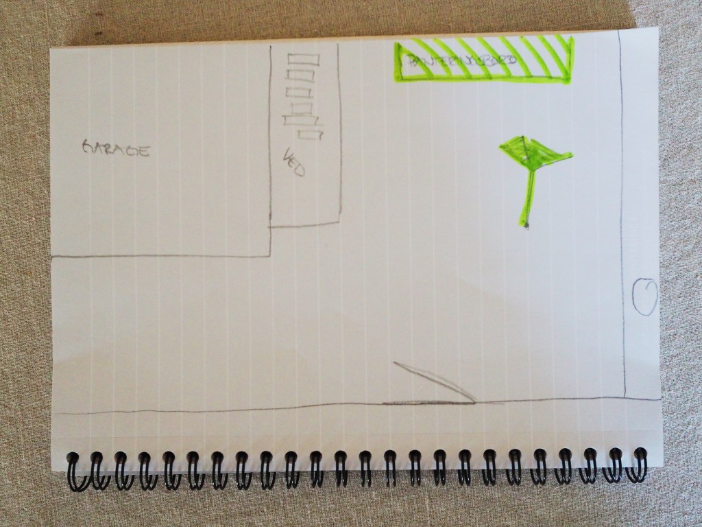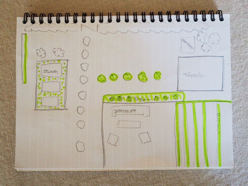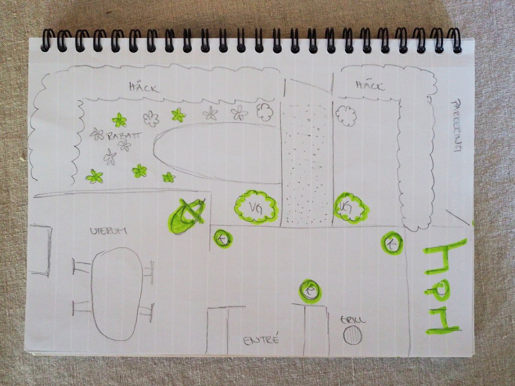 Igår när jag satt på altanen ute i solen och bebisen sov i vagnen bredvid skissade jag på trädgården och vad jag vill att vi gör med den i år. Självklart har jag hur många önskemål som helst och vi kommer säkert inte hinna genomföra allt, men det är bra för mig att i alla fall ha en idé om hur jag vill att det ska se ut. Det här är bara andra året med en trädgård för oss, så allt är lite nytt och det är bra att få ned det på papper. Sedan har vi ju det där lilla problemet att jag inte kan rita för att rädda mitt liv, men det får helt enkelt se ut som att ett barn har gjort det. Ett barn som inte kan rita ett rakt streck och som saknar all form av uppfattning av proportioner, vill säga.