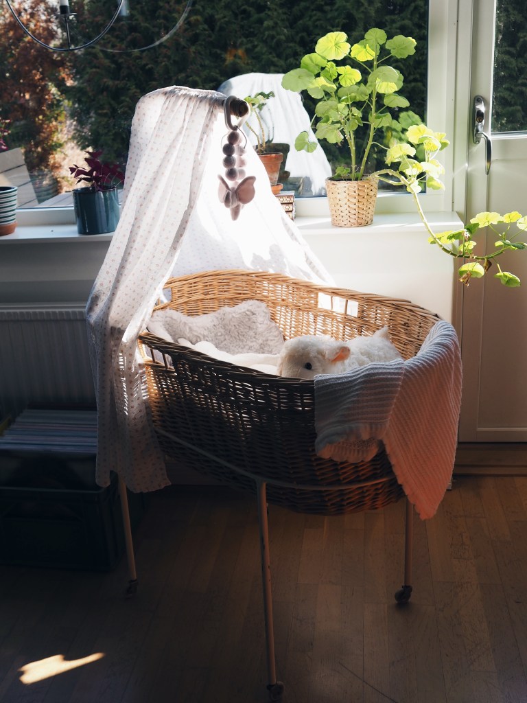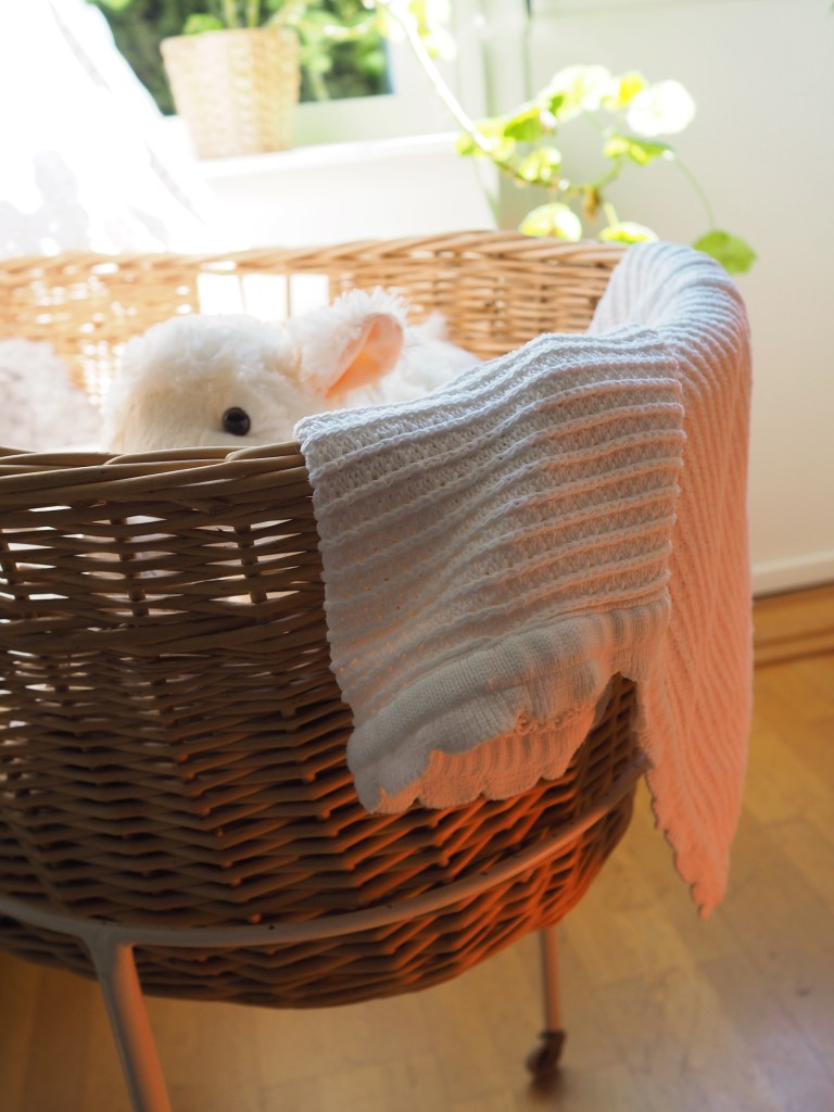 Bebisens korg, som han har ärvt från sin farmor och som också står i vardagsrummet, har fått en sommarbäddning. Den virkade katten har min mamma gjort.