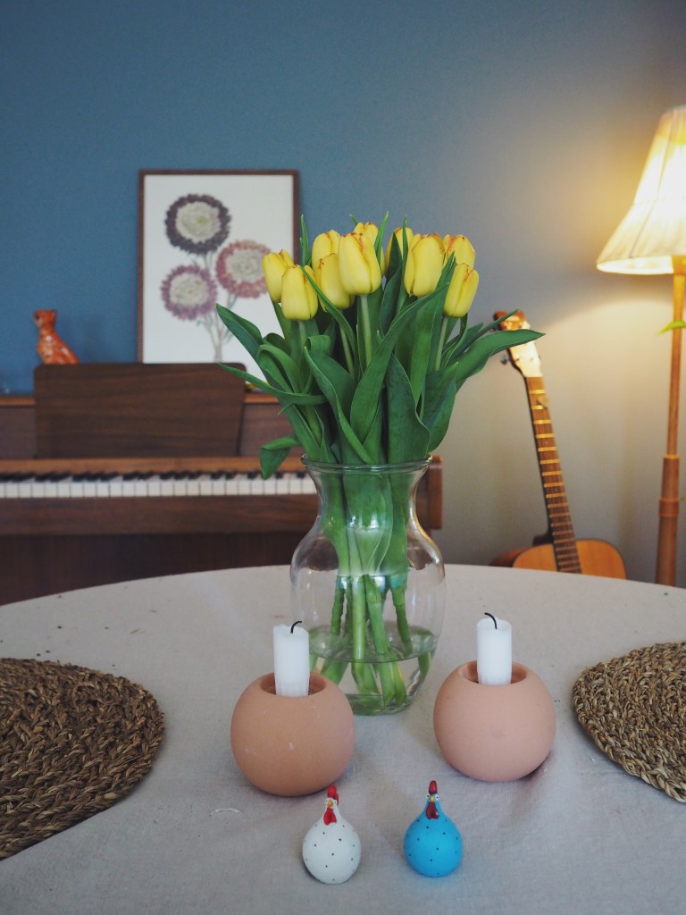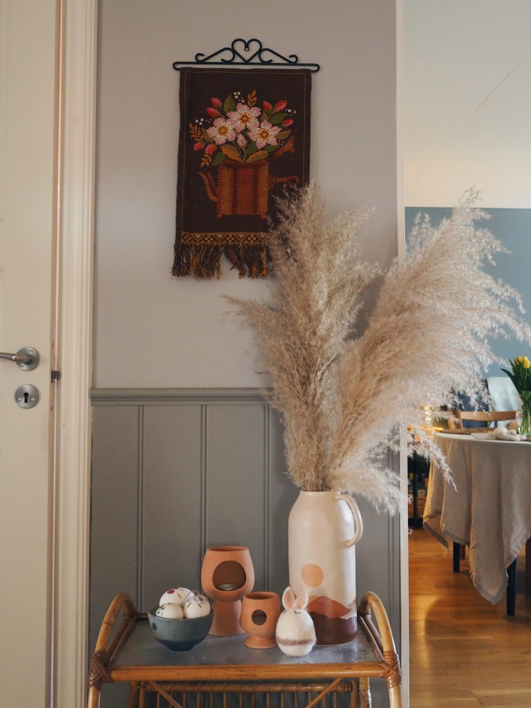 Jag har aldrig i mitt liv påskpyntat tidigare. I år gjorde jag det. Kanske har det något att göra med att jag har fått barn? Det känns som en sak som barnfamiljer gör. Hade jag haft tid hade jag till och med pysslat! Jag pysslar aldrig! Men eftersom jag den största delen av dagen har en bebis på armen blev det inget pyssel i år, bara köpepynt…