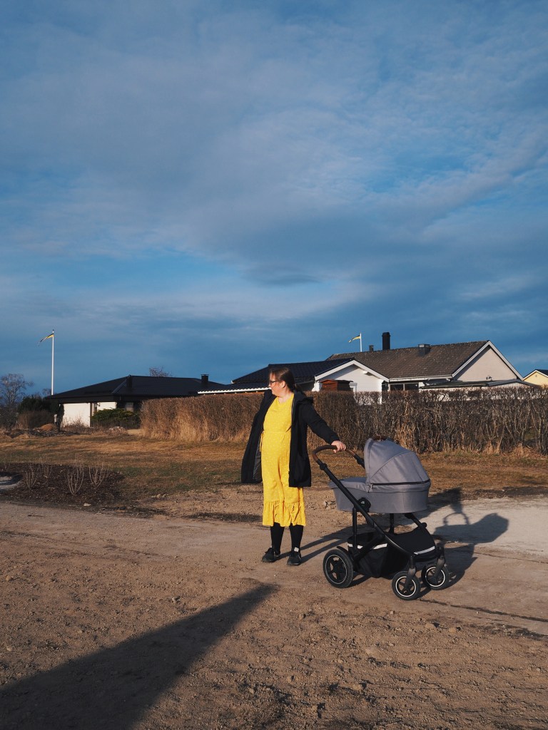 Vi tog en promenad i solen. Här är min mamma med vagnen.