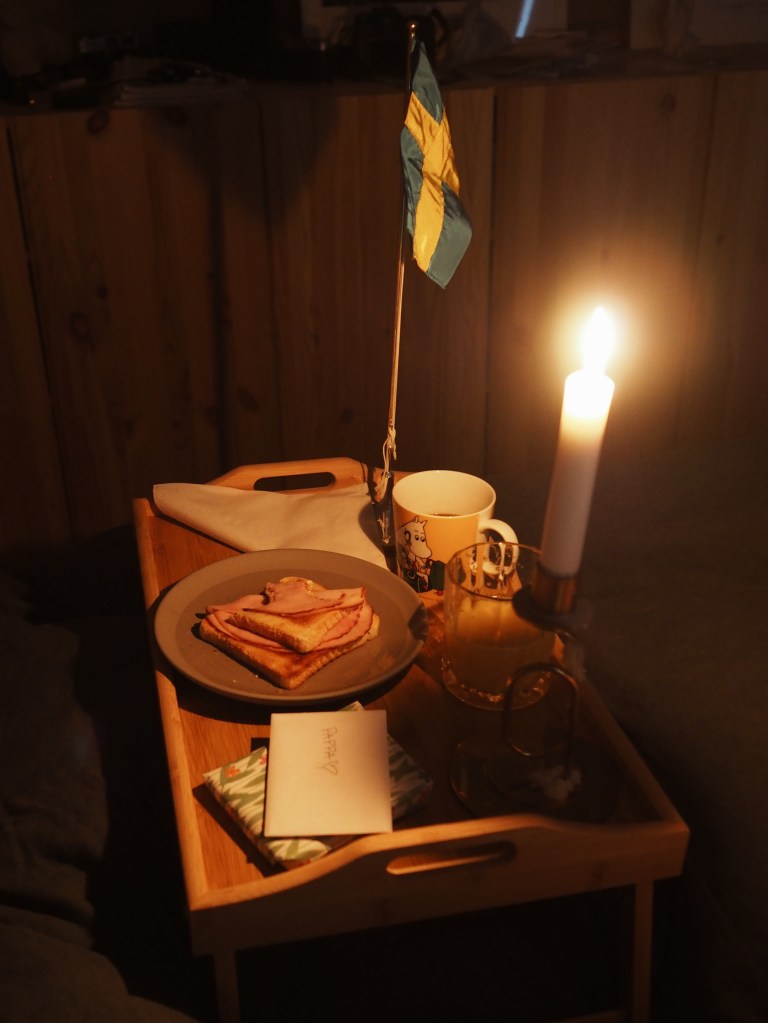 Födelsedagsbrickan på sängen med skinkmackor, kaffe och juice. Dopflaggan och det livsfarliga ljuset var också med såklart!