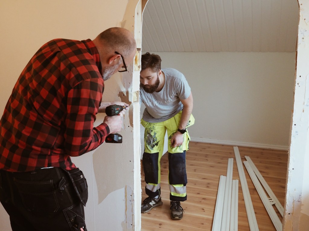 När övervåningen byggdes på 70-talet var det två sovrum på övervåningen, men någon ägare har i efterhand byggt igen den ena dörröppningen och tagit upp ett valv (varför alla dessa valv?!) i väggen mellan rummen istället. Det har således blivit som ett rum som leder till ett annat rum. Vi ser inte riktigt poängen i det, så vi återställer det nu till en planlösning som makear sense, så att säga. Vi tar upp dörröppningen igen och bygger igen valvet, så att det blir två separata sovrum. Vi ska sedan även spackla, måla om och sätta upp nya lister (så att det blir enhetligt på hela övervåningen).