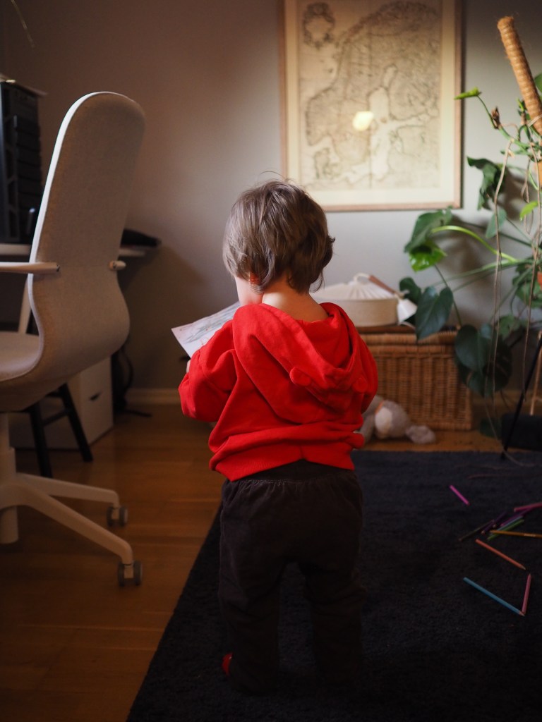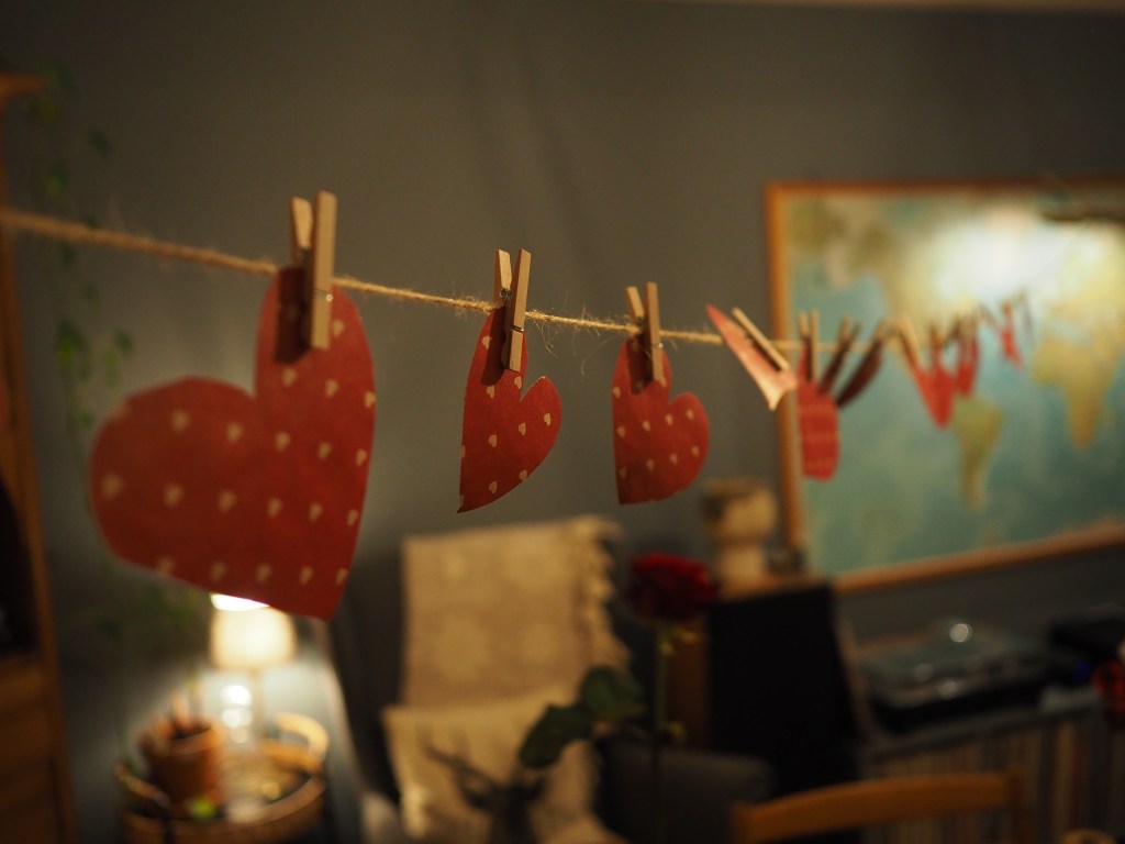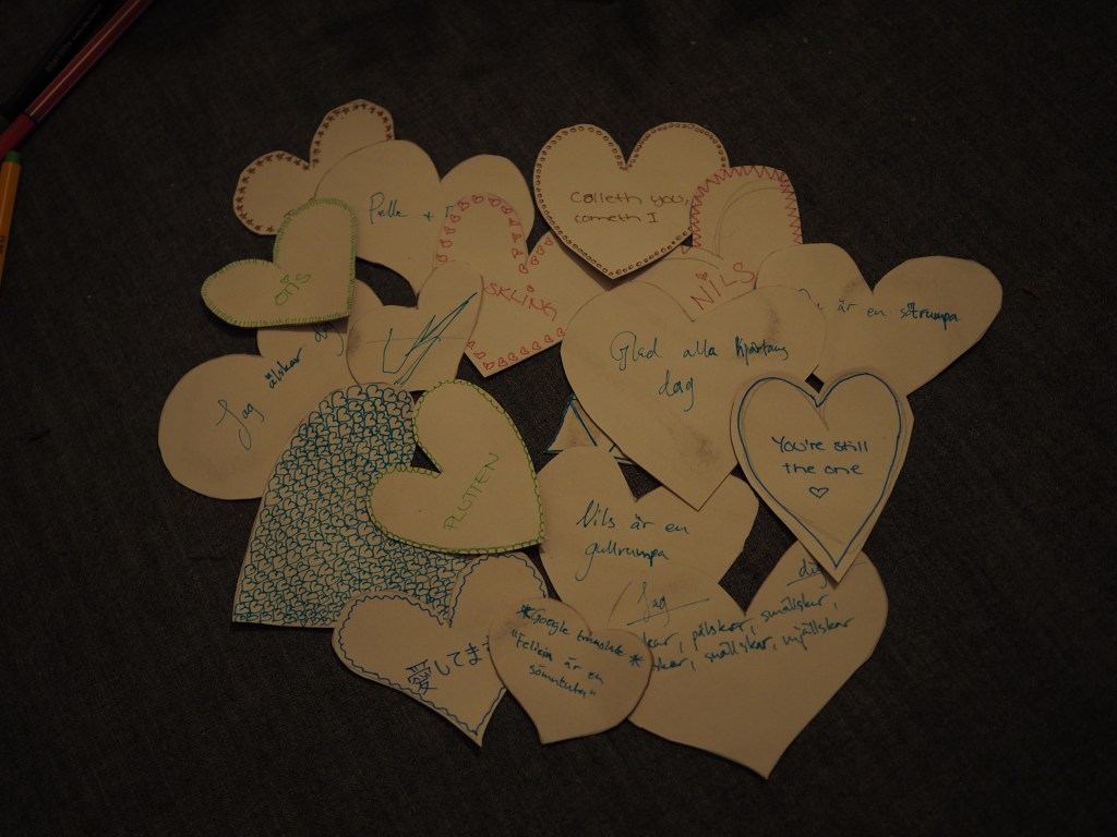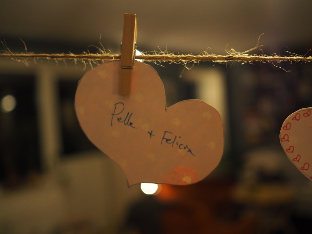 Pappalediga Pelle hade också förberett ett litet alla hjärtans dag-pyssel till oss. Vi klippte ut hjärtan, skrev hälsningar på dem och hängde upp dem som en girland ovanför vardagsrumsbordet. Det blev jättefint, tycker jag som är helt opartisk. Och en himla mysig tradition att hålla i även sen när vi har större barn, som kan vara med på det!