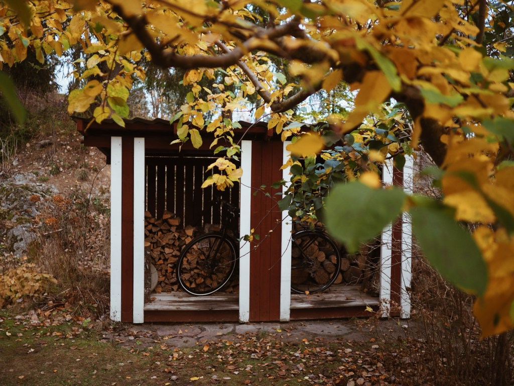 Här gjorde vi ingenting, det är bara min favoritvy på hela tomten. Vedskjulet under äppelträdet.