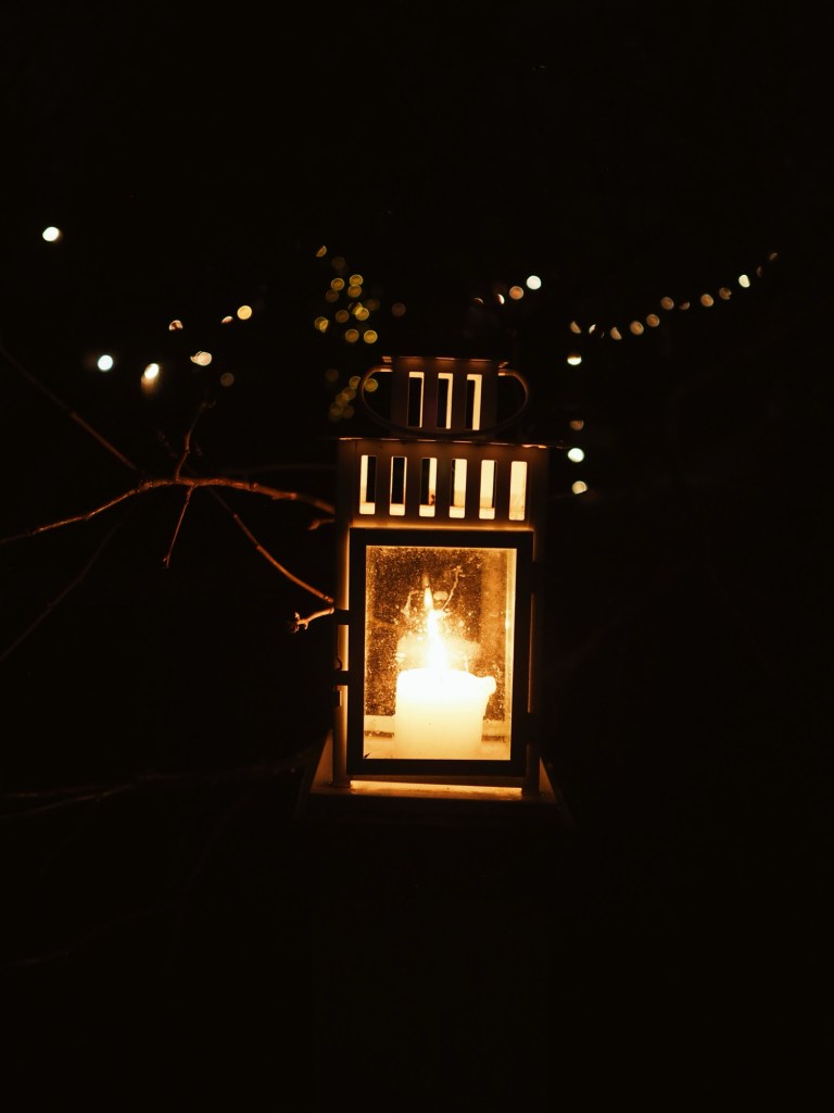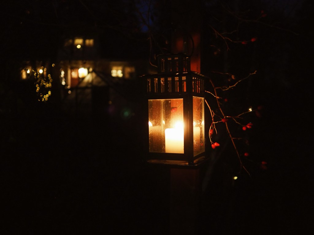 Vi tände också lite ljus i lyktor som min pappa har lämnat i trädgården. Det hjälper barn att våga ta sig upp till huset. Vägen är annars så mörk att det är lite läskigt att gå genom tomten (det ska vi göra något åt någon gång).