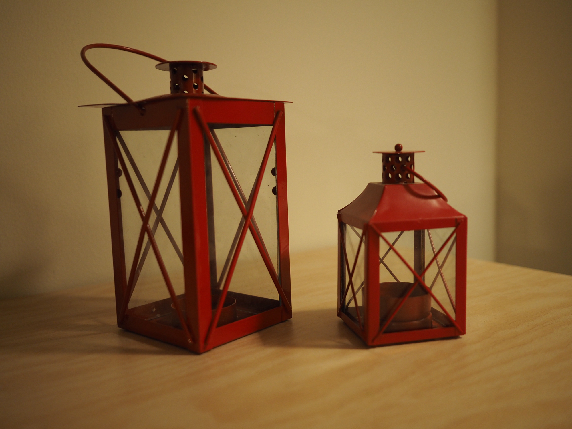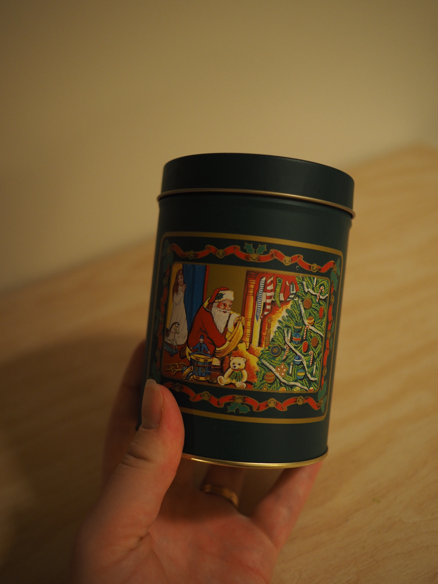 Lite mer julpynt. En tomtemor, en plåtburk i jättefint skick och två röda lyktor.