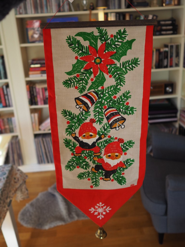 Även den här fantastiska väggprydnaden med tomtar på, och en liten ringklocka i änden! Magisk! Jag ska hänga den tillräckligt högt upp så att barnen inte når den bara.