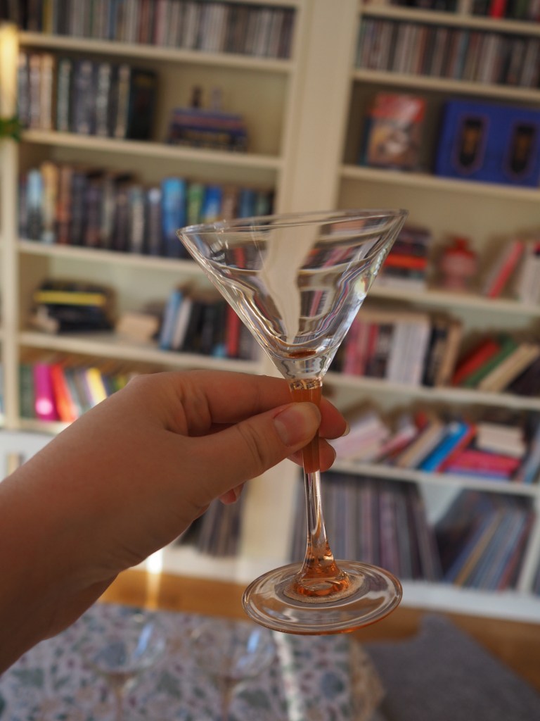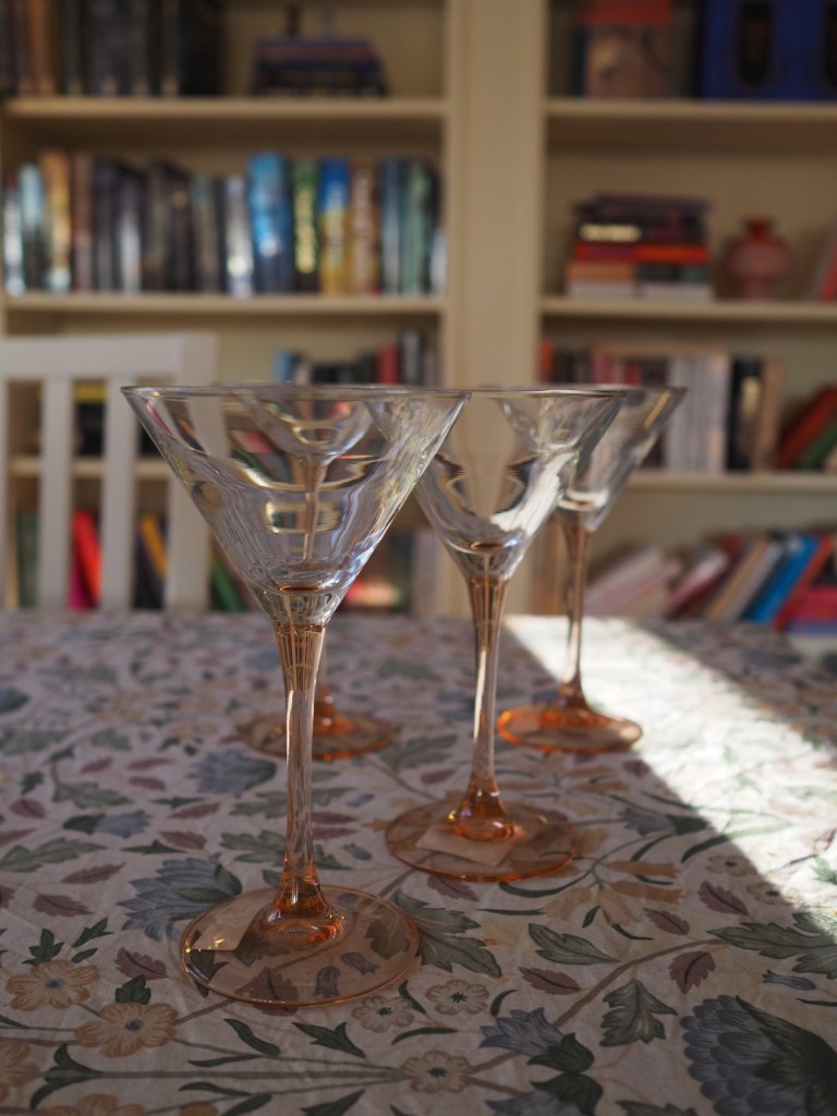 Helt fantastiska drinkglas med rosa fötter. Älskar färgat glas! Det fanns bara fyra, men de var utspridda, så jag var glad att jag hittade dem i alla fall.