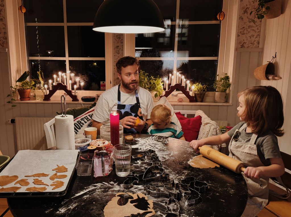 Vi har bakat pepparkakor! Jag har längtat efter att barnen ska komma upp i den åldern att de kan börja tycka det är kul att pyssla, och Nils börjar väl närma sig. Han tyckte att det var kul att göra typ fem pepparkakor, sedan satt han och kavlade i tjugo minuter och sedan började han ploga mjölet med sin plogbil. Men jag slapp i alla fall sitta där själv efter att Pelle var tvungen att springa iväg för att stoppa Märta från att ramla ned från inredningen.