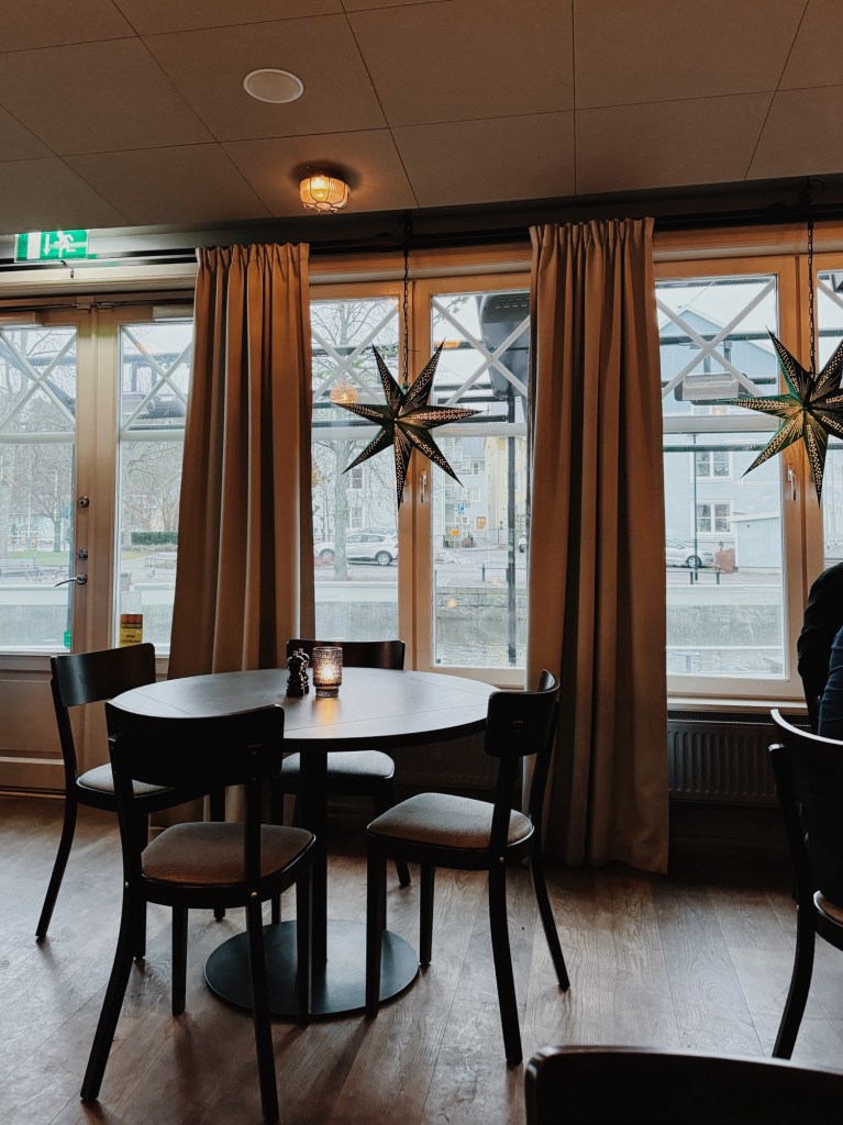 Inrökta och genomfrusna tog vi båten över vattnet och åt på Blå Dörren. Baconinlindad och västerbottensostfylld kycklingfilé och béarnaisesås. Herregud. Det var så gott att det vattnas i munnen när jag tänker på det.