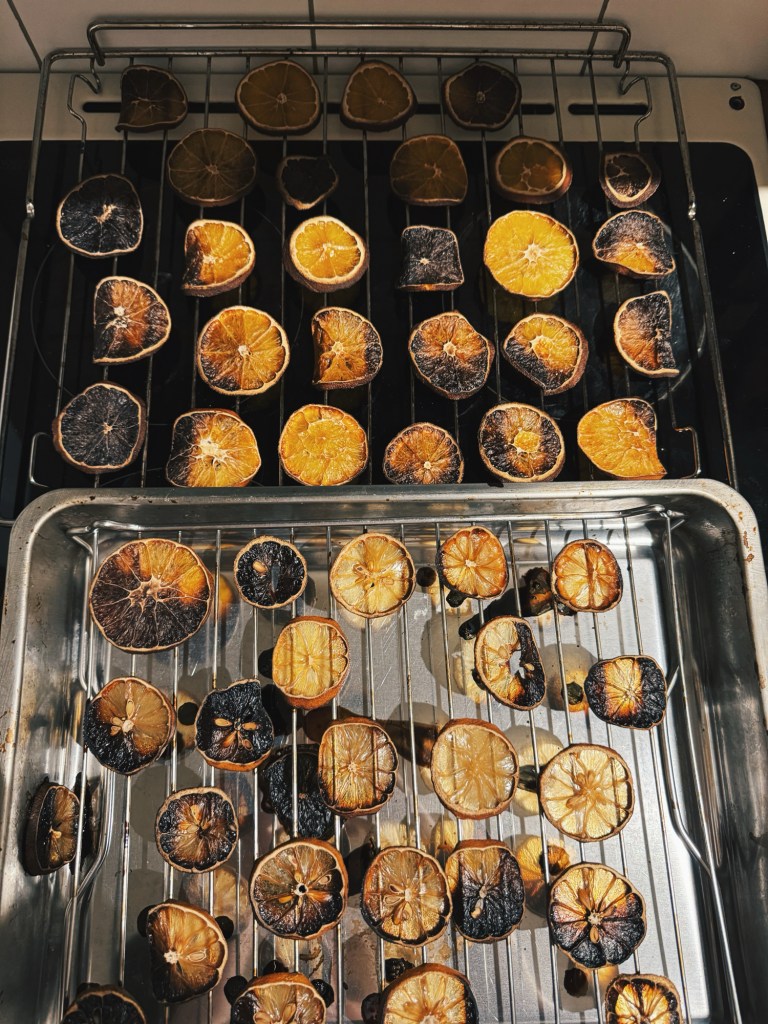 En dag tänkte jag att jag skulle torka apelsin- och citronskivor och göra vackra girlanger av dem. Jag hade till och med sparat platser för dessa framtida girlanger och undvikit att julpynta just där. Hittade tid till det en dag när jag jobbade hemifrån, googlade fram instruktioner och följde dem noggrant. Resultatet blev inte vackra girlanger av torkade skivor. Resultatet hamnade i soporna och jag var på dåligt humör resten av dagen. Jag testar nästa år igen.
