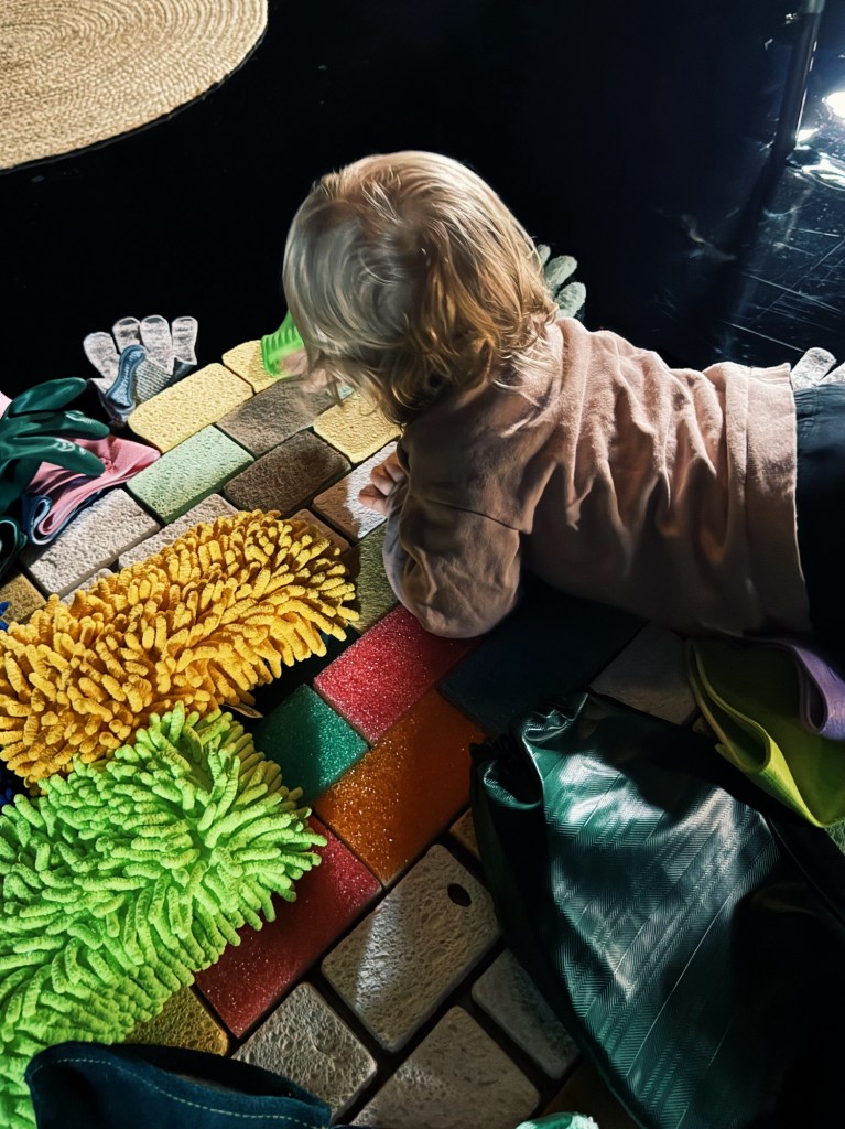 Jag vet inte vad jag förväntade mig av en dansföreställning för bebisar, men det var inte vad vi upplevde. Föreställningen var totalt tre timmar lång, och man fick gå och komma som man ville. Vi stannade i ungefär en timma. Rummet var mörkt och bebisarna (med sina vuxna) fick röra sig fritt bland rekvisitan, som var i olika färger och material och lyste eller prasslade eller reflekterade. Det var två dansare som rörde sig bland bebisarna och speglade bebisarnas rörelser och ljud. Det innebar att de för det mesta ålade omkring på golvet och gjorde konstiga ljud.