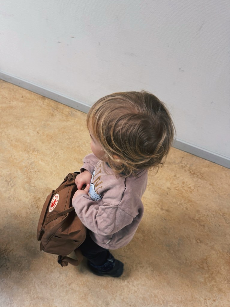 Sedan var det dags! Kolla lilla Märta som går genom korridorerna, stolt bärandes på sin egna Kånken. Det var oerhört viktigt att hon skulle bära väskan själv, för den var tung och alla sa hur hon stark hon var. Och vi tog hissen, och hon fick trycka på alla knappar hon kunde nå. Lilla lillasyster blev så stor när hon fick vara själv.