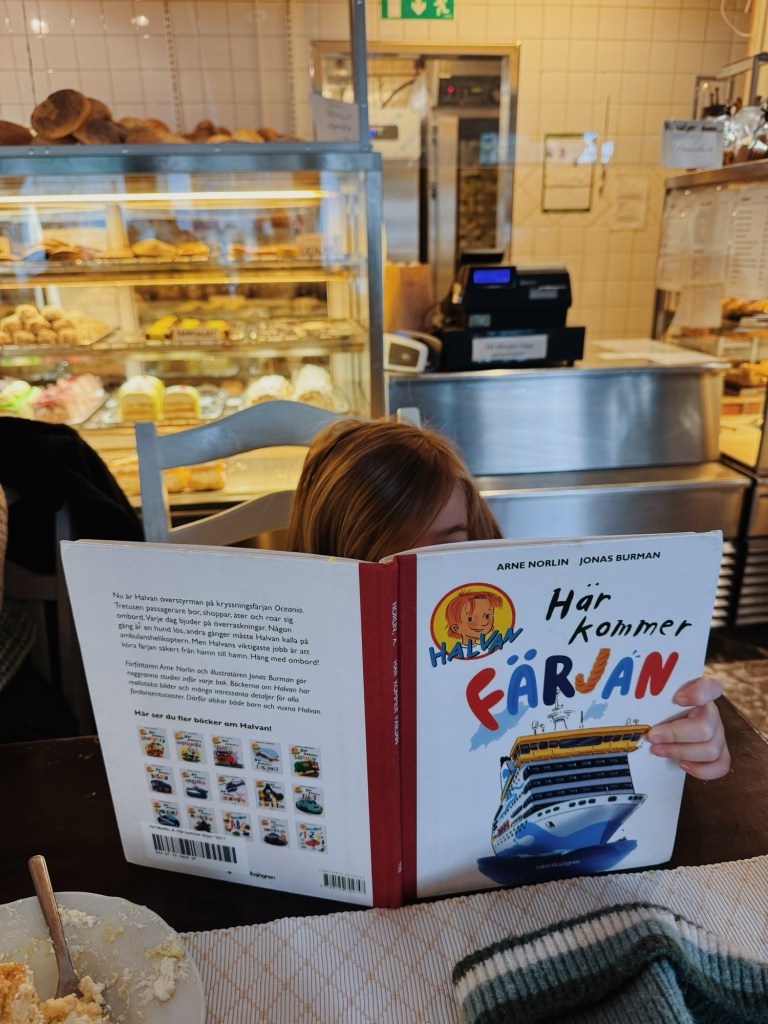 Vi gick till ett kafé och fikade, och Nils tröttnade så på vårt prat att han tog fram en bok. Jaha.