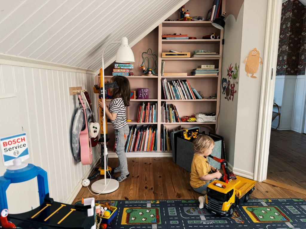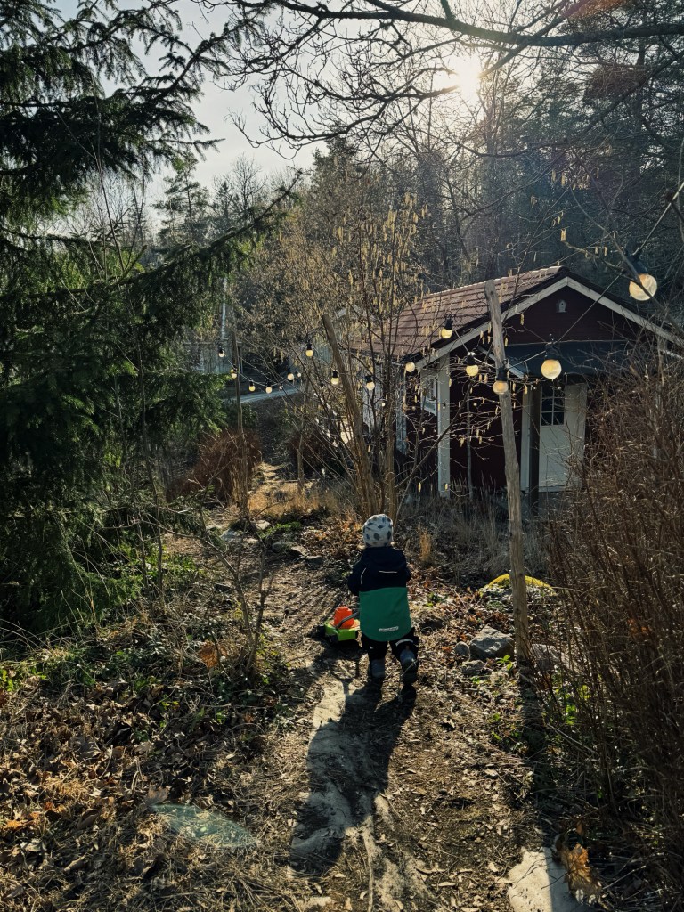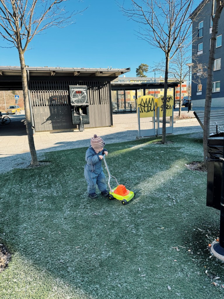 En vabb-fredag med relativt pigga barn gick vi och fredagsfikade tillsammans för första gången sedan jag var föräldraledig. Märta vägrade gå hemifrån utan sin gräsklippare, så vi passade på att klippa konstgräset vid cykelgaraget.