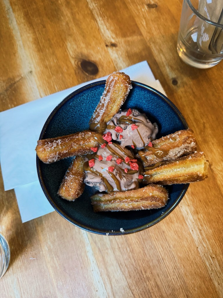 Vi åt brunch på Chelas vid Hornstull. Det var autentisk mexikansk mat, och självklart vågade vi inte smaka det de rekommenderade, utan tog de vitaste valen vi kunde. Munnen brann ändå. Men det var gott! Och vi fick churros med chokladglass till efterrätt (även där ignorerade vi deras säkert jättegoda rekommendation). De hade också en toalett som jag älskade. Så fin?