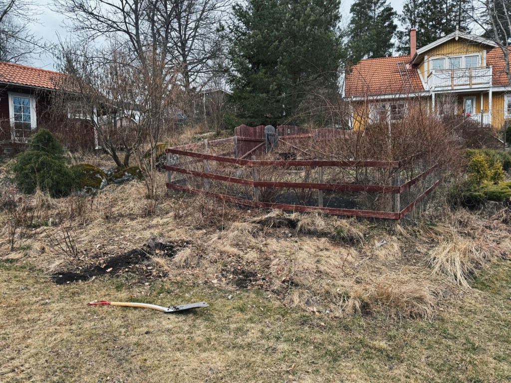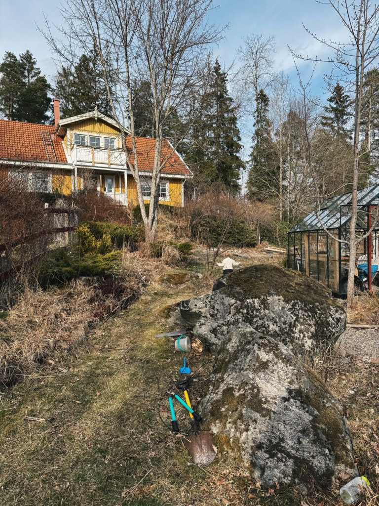 Målet med helgens trädgårdsarbete var att rensa bort en övervuxen rabatt som vi varken har koll på eller ska ha kvar, och att i det också flytta två svartvinbärsbuskar till köksträdgården, och ta ned en hassel som har stått i vägen. Och innan ni ringer mig och skrattar åt mig, mamma och pappa, så misstänker jag redan att vi har flyttat tillbaka buskarna dit de stod för några år sedan och vi kan faktiskt inte ringa er för allting, vi måste få testa själva också! (Sagt med kärlek såklart, jag vet att ni aldrig skulle skratta åt oss på riktigt.)