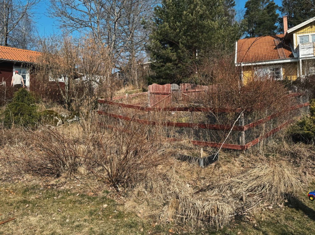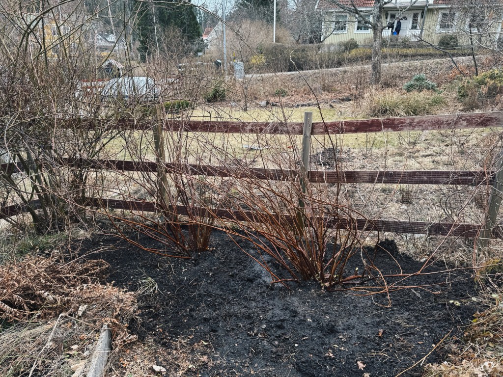 Resultatet efter helgens arbete! Jag ska vara helt ärlig och säga att jag också har svårt att se skillnad. Allt är brunt och stökigt bara. Men, det är skillnad, jag lovar! De två stora svartvinbärsbuskarna har tagit ogräspallkragarnas plats och vi ber till högre makter att de överlever flytten, rabatten är borta och väntar nu på att få grävas upp och omvandlas till gräsmatta, och den elaka hasseln är ett minne blott. Skön känsla inombords, även om hela kroppen värker.