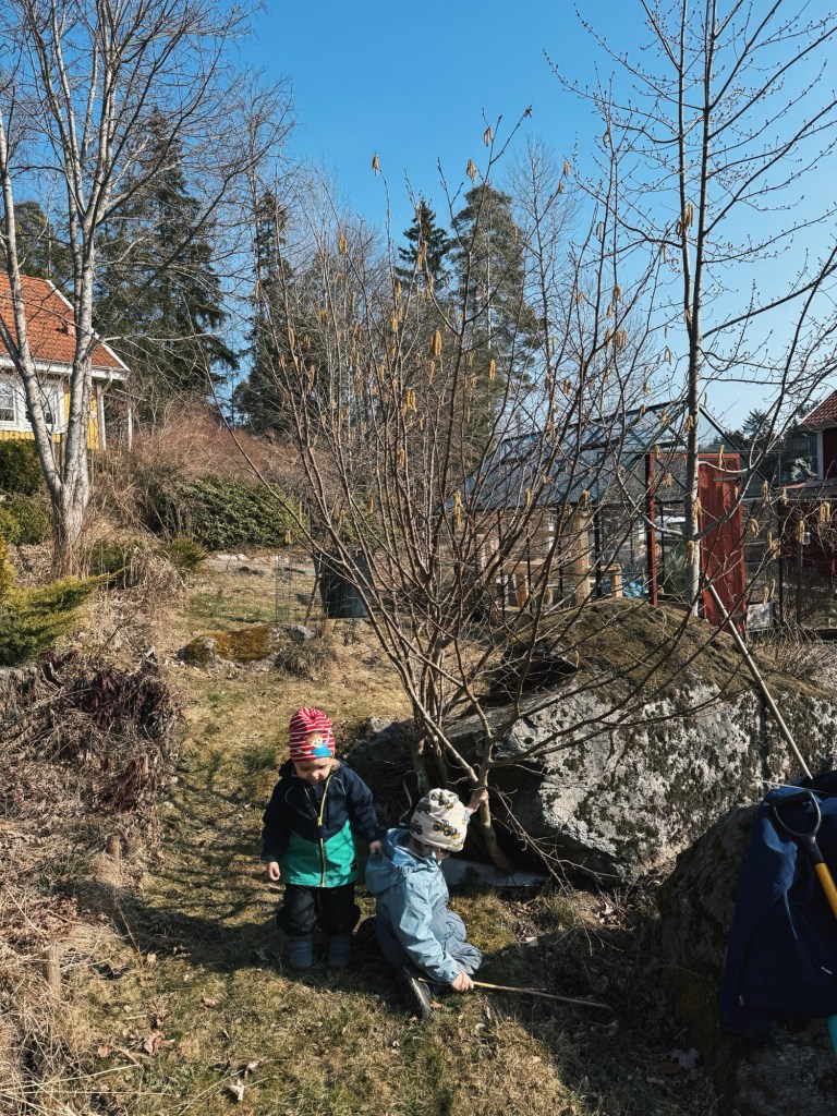 Rensa rensa rensa. Och jag måste passa på att hylla mina fantastiska ungar. De är så otroligt roliga när vi är ute och jobbar i trädgården. De släpar pinnar, gräver hål, sågar (med sin ofarliga såg), vattnar, fraktar jord med grävskopa och lastbil och även om det kanske råkar hänga med växter och grenar som ibland hade kunnat vara kvar är jag bara så glad att vi kan få saker gjort tillsammans att de får hålla på. För ett år sedan trodde jag aldrig att vi skulle kunna göra skillnad på tomten och i huset utan barnvakt, men det visar sig att äldre barn klarar sig lite mer skillnad. Vem hade kunnat tro det?