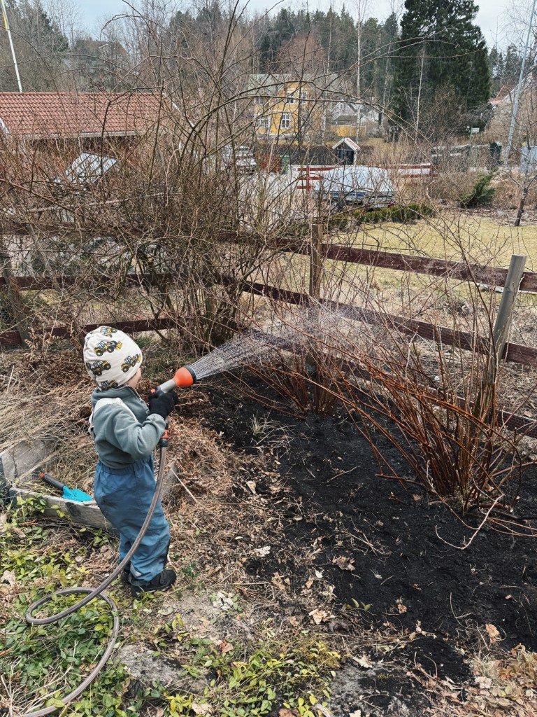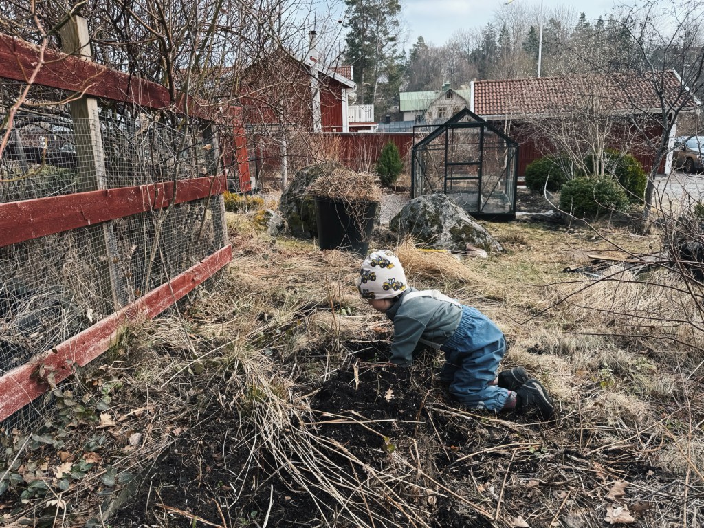 Helgen, som var oplanerad med undantag för en filmkväll där jag och min syster tvingade våra män (okej, det kanske inte var så mycket tvång i slutändan, men vi fick dem) att se Wicked, som nu går att köpa på Apple TV och SF Anytime… Anyway, helgen spenderades i trädgården. Hela lilla familjen var ute och grävde i jord hela dagarna, så trots att Pelle gått med dammsugaren klistrad i handen sedan dess (dammsugning är hans jobb, eftersom det är värre än döden att dammsuga) har vi jord i hela huset. Det är nästan pinsamt att skicka barnen till förskolan med sina skor, eftersom strumporna blir helt svarta när de stoppar ned fötterna i dem. Jag har lärt mig till nästa gång att barnen ska ha stövlar på sig, oavsett regn eller sol.