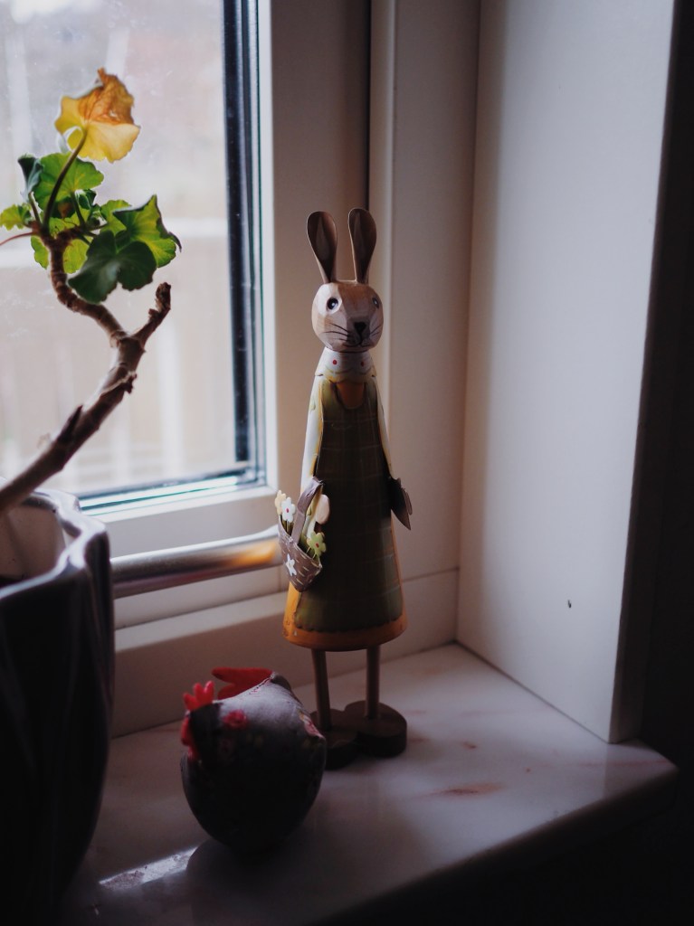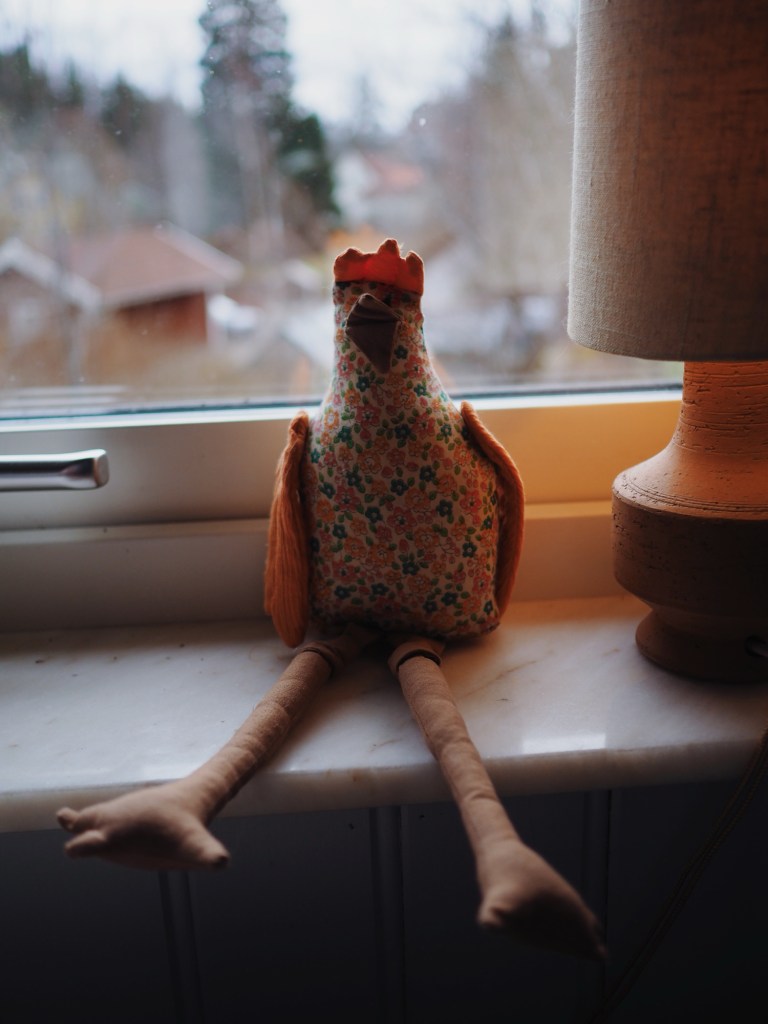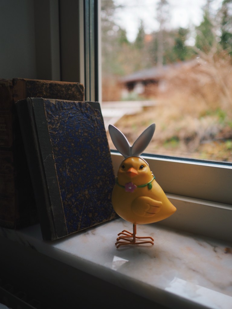 En kyckling med kaninöron har fått flytta in i fönstret. Köpt på Ica Maxi, för vem orkar vara snobbig.