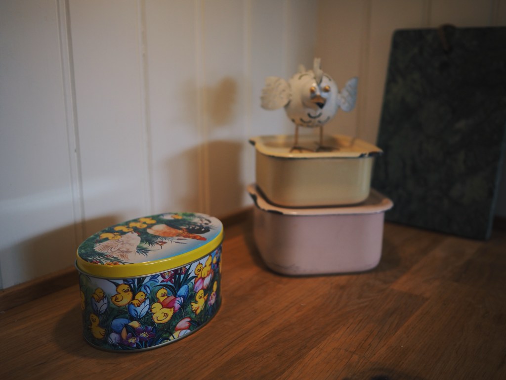 Plåtburkar med påsktema och en plåtkyckling i köket. Jag tycker i allmänhet att det är svårt med påskpyntet. Vi har inte tillräckligt mycket av det för att det ska bli en ”påskig” känsla i hela huset, och sakerna i sig är ofta så små att de lätt ser malplacerade ut när de står för sig. Att göra små stilleben med påskpyntet var målet i år, med mer och mindre lyckade resultat. Det här ett av de mindre lyckade, uppenbarligen.