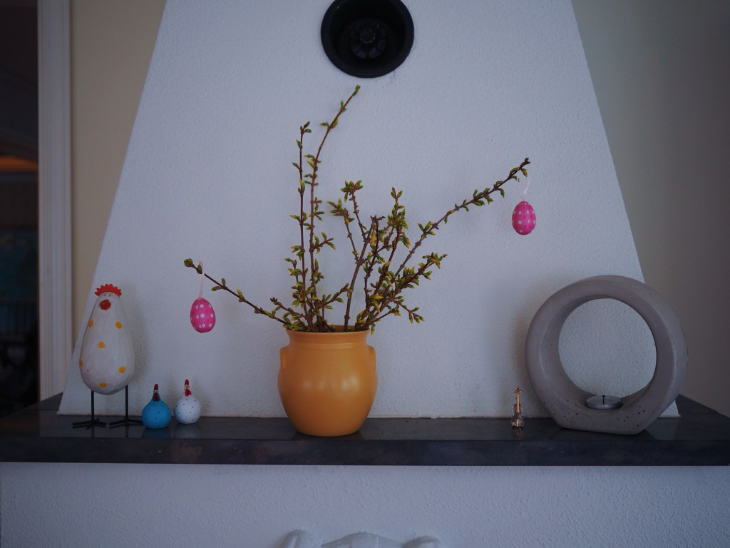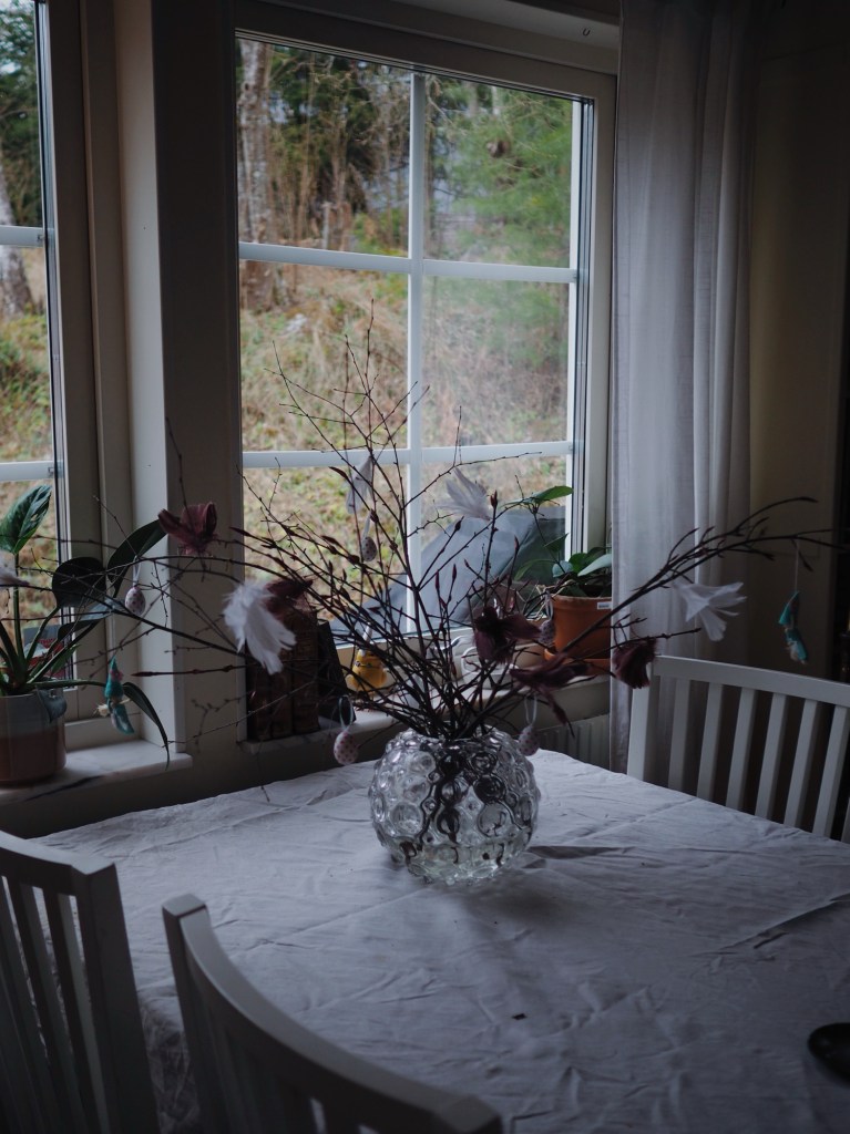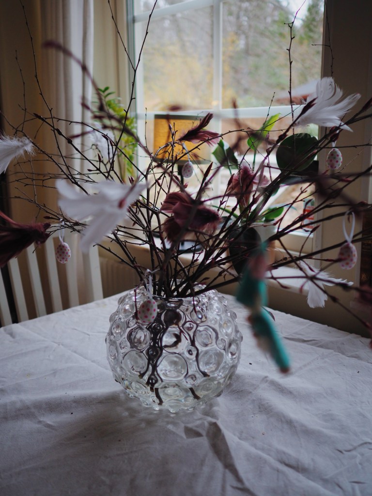 Och så påskriset såklart. Är fortfarande ovan vid att ha en tomt med växter på, så att jag bara kan gå ut genom dörren och plocka vackra grenar och blommor och de är mina, så ingen blir arg. Det är en omställning att slippa ta sig till en skog och leta fina växter bland tallar och fimpar och döda granar och McDonaldsmuggar. Det är ren lyx och jag är så obeskrivligt tacksam att mina föräldrar är trädgårdsintresserade, och sedan sålde sitt hus till oss.