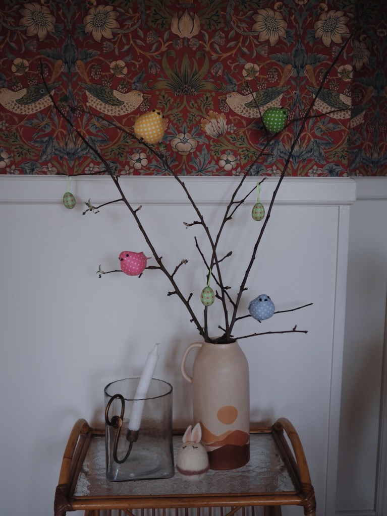 För några veckor sedan tog jag in några äppelkvistar för att se om jag kunde få dem att blomma, men det verkar vara för varmt och soligt på vår övervåning (stackars oss), så de kommer inte så mycket längre än såhär. Så jag hängde upp lite ägg och stoppade dit några fåglar för att liva upp dem!