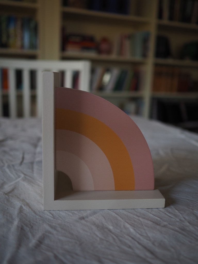 Ett bokstöd till antingen ett barnrum eller till vår DVD-hylla (gud, det var länge sedan någon skrev det ordet). Våra filmer ramlar ned hela tiden.