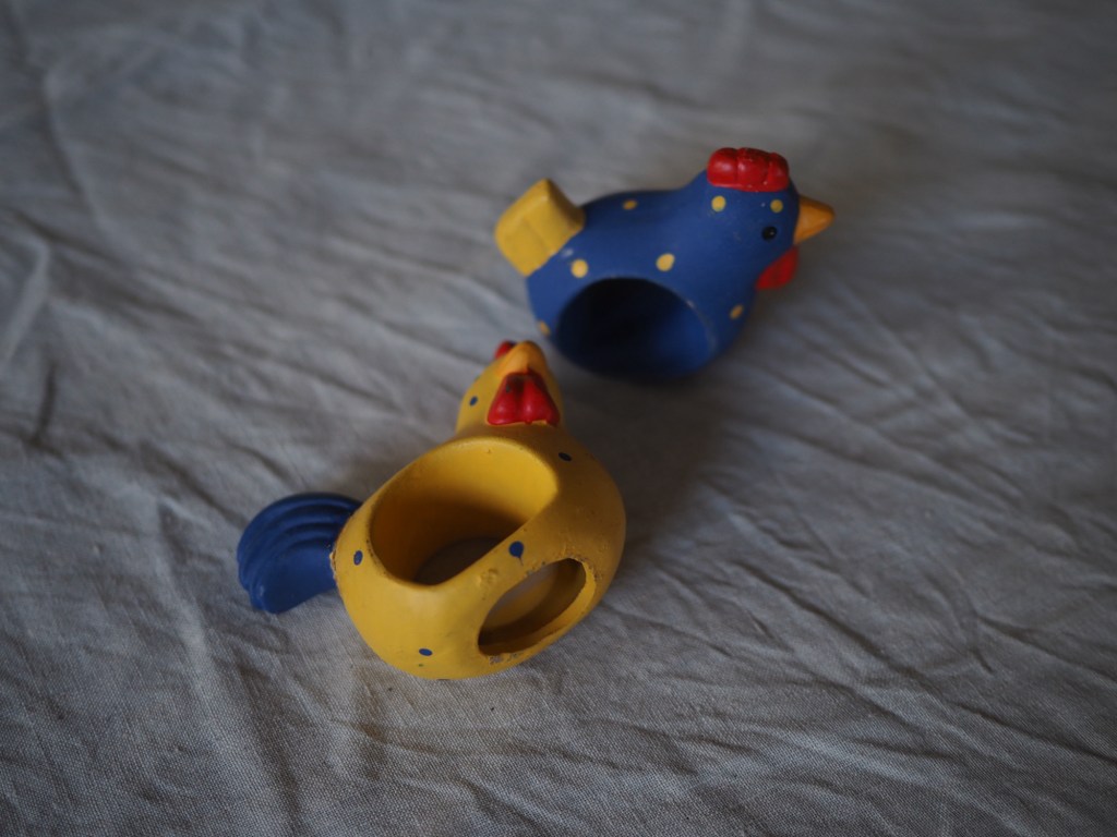 Två servettringar i form av prickiga hönor. Älskar prickiga hönor! Det är så synd att det bara fanns två, men jag får väl göra det mitt livs mål att hitta några till. Jag får åka runt på loppisar veckorna innan påsk varje år tills jag har minst sex stycken. Hur lång tid tror vi det tar? Tio år?