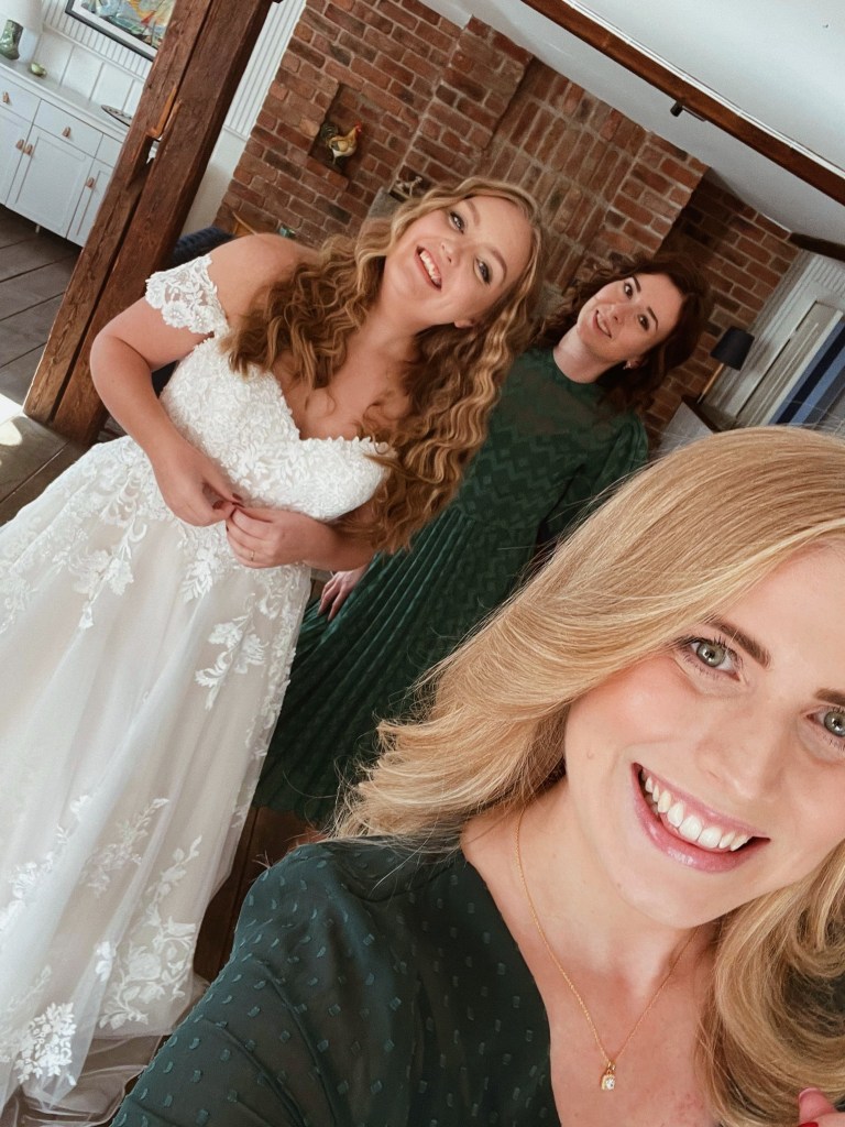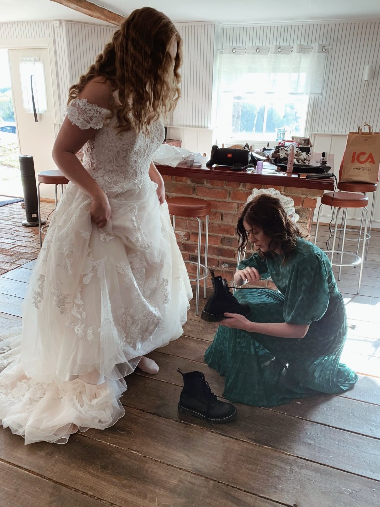 Fotografen var inte med när vi gjorde iordning oss, men några bilder har jag därifrån ändå. Jag och min man valde att göra iordning oss i separata lägenheter (det fanns två lägenheter i anslutning till lokalen, som vi och brudföljet bodde i under bröllopshelgen) och sedan ses först utanför kyrkan för ”first look”. Min syster och brudtärna var den som sminkade mig och fixade mitt hår, precis som hon alltid gör och har gjort, och mina bästisar och toastmadames var också med på förmiddagen. Min mamma var också där och vaktade Nils, som hatade hela idén med bröllop.