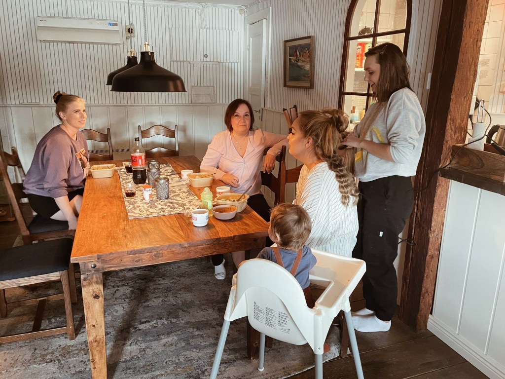Här åt vi lunch tillsammans. Vi hade beställt sallader i förväg, som min svåger fick åka och hämta. Jag åt typ fem procent av min sallad, eftersom jag var så nervös och stressad. Sminket och håret tog mycket längre tid än vi hade räknat med och vi blev sena med allt.