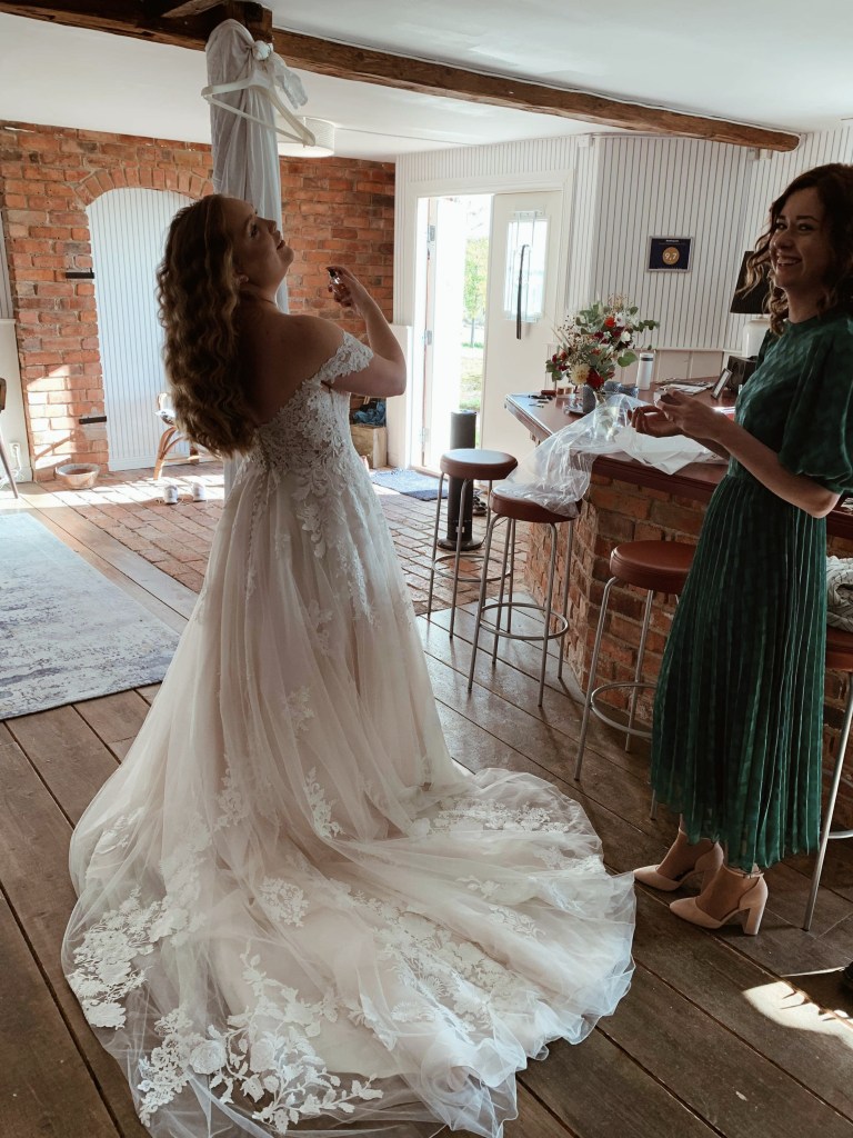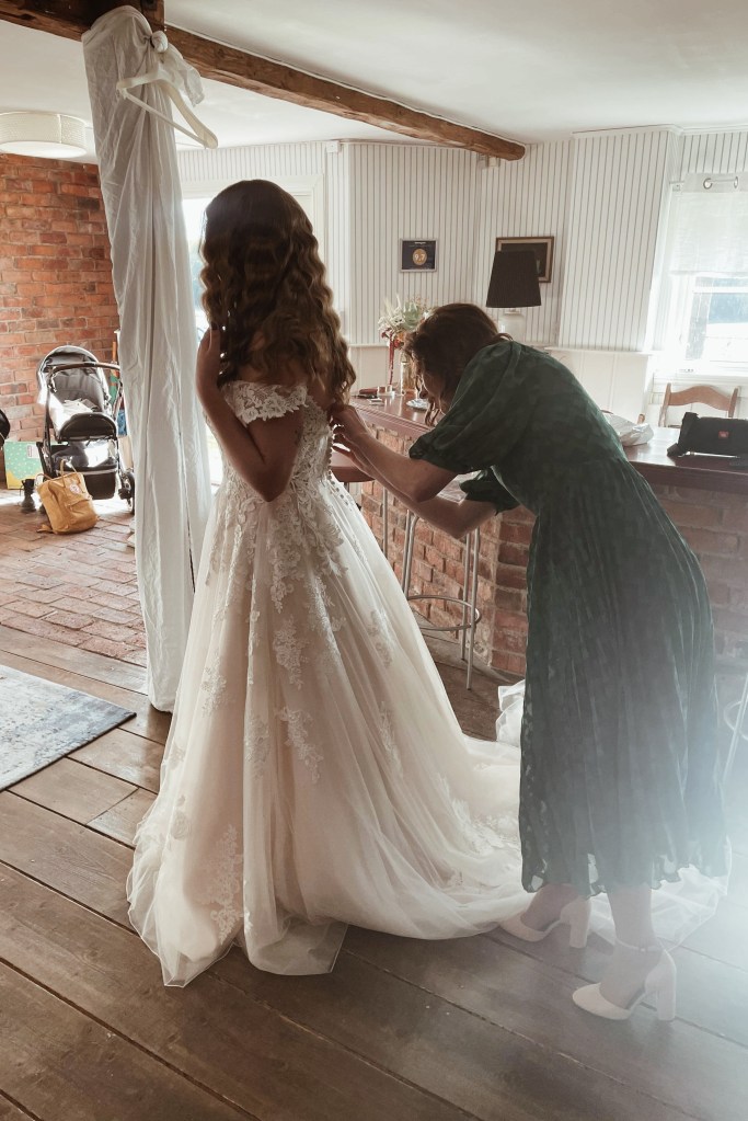 Toastmadame Alina knäpper vant klänningsknapparna. Hon har knäppt knappar både på min och på den andra toastmadamen Annikas bröllopsklänningar. Jag valde en riktig prinsessklänning till mitt bröllop. Den var hutlöst dyr och motsatsen till vad jag hade tänkt ha på mig. Egentligen skulle jag ha någonting ”enkelt” och ”inte så dyrt”, eftersom det är en klänning en endast använder en gång. Men när jag var iväg och provade klänningar trivdes jag inte i de enkla, tråkiga klänningarna och till slut insåg jag att jag har ett tillfälle i livet att få känna mig som en Disneyprinsessa, och det är på mitt bröllop, så varför inte ta den chansen? Efter lite om och men och finansiell hjälp fick jag tag på min drömmiga klänning. Det enda tråkiga, som jag ju inte hade kunnat förutspå, var att efter att ha svettats och kramats och poserat en hel dag töjde klänningen ut sig. Den blev därför för stor runt midjan och bysten på kvällen, vilket syntes. Det var tråkigt, men jag får hoppas att våra gäster vid den tiden inte längre brydde sig så mycket om hur bröllopsklänningar satt.