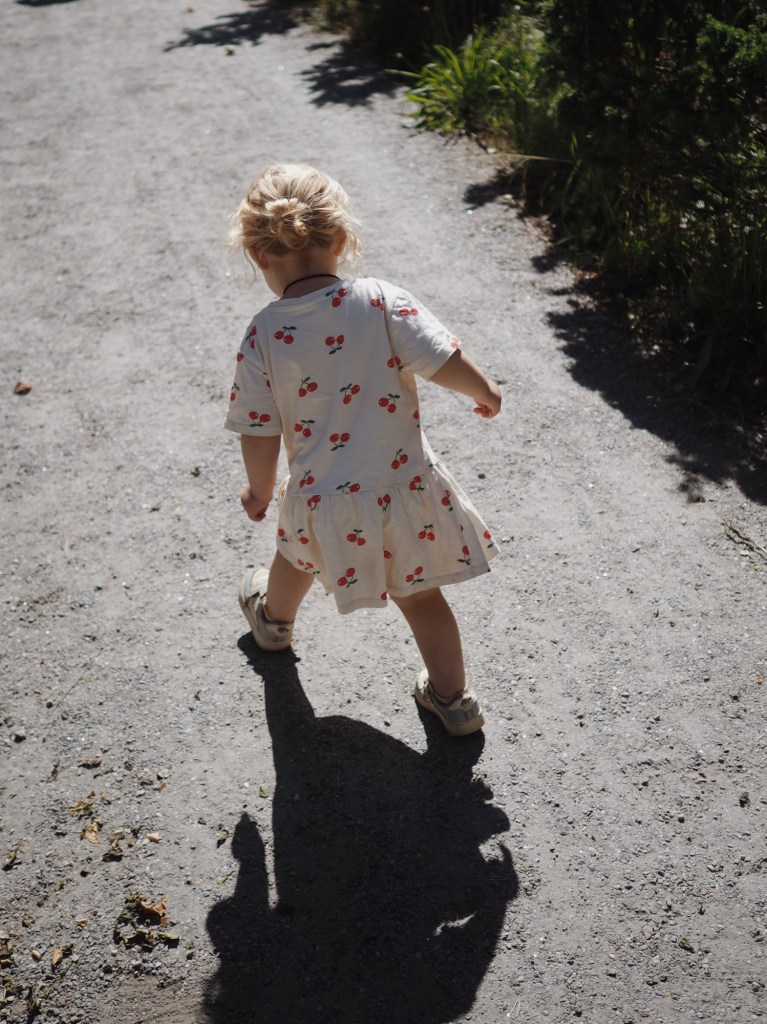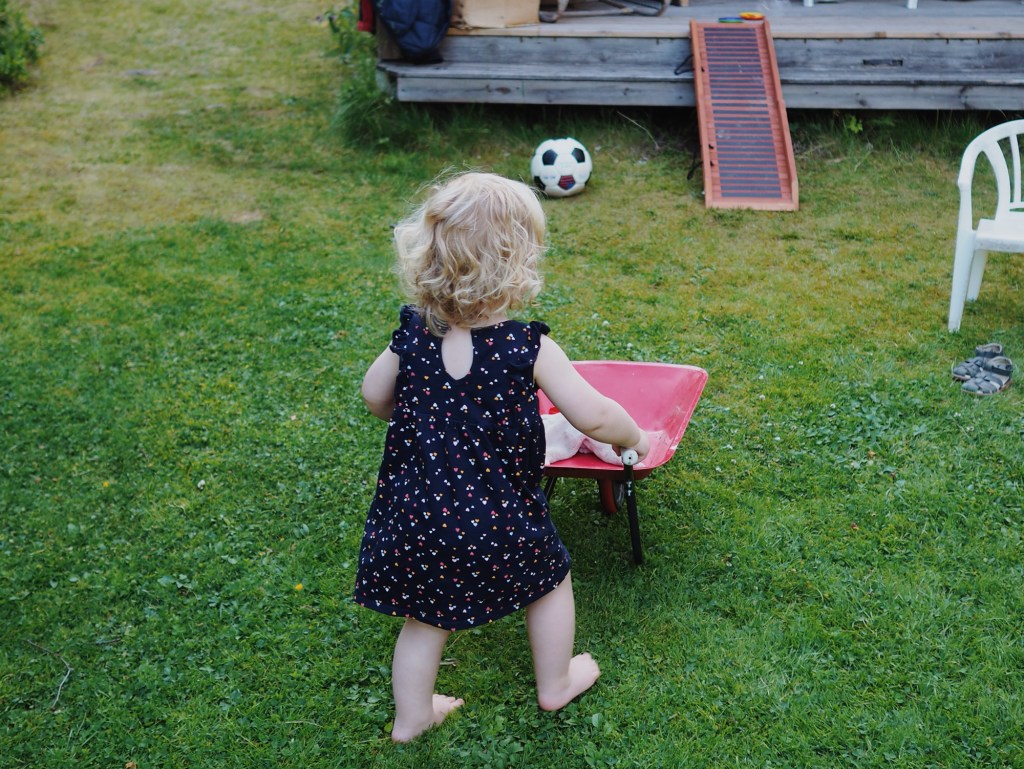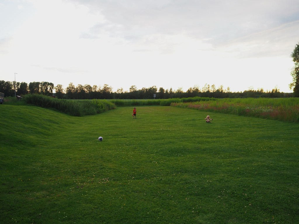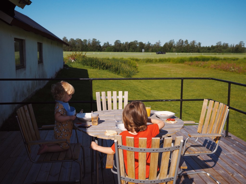 Efter en hel dag med bilåkande var barnen inte direkt trötta vid läggdags. Så de fick springa av sig på den inte så lilla gräsmatta som fanns utanför stugan.